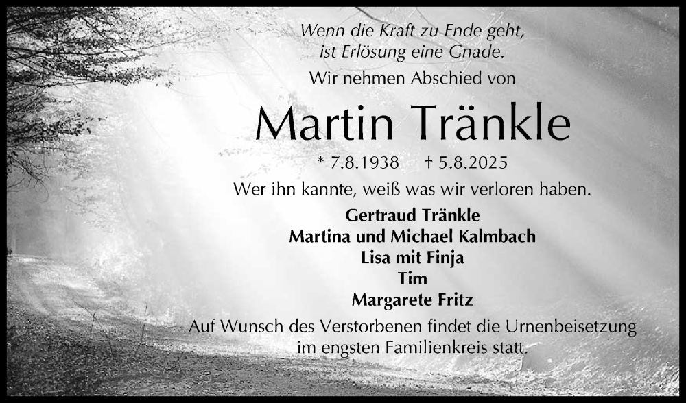 Hier finden Sie alle Traueranzeigen aus der Zeitung, die bisher für Martin Tränkle erschienen sind. Weitere Traueranzeigen, die in der Zeitung erscheinen, werden hier ebenfalls aufgelistet