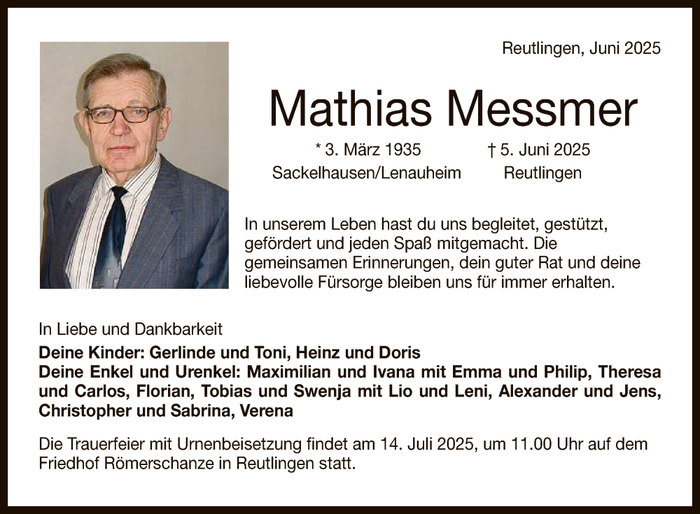Hier finden Sie alle Traueranzeigen aus der Zeitung, die bisher für Mathias Messmer erschienen sind. Weitere Traueranzeigen, die in der Zeitung erscheinen, werden hier ebenfalls aufgelistet