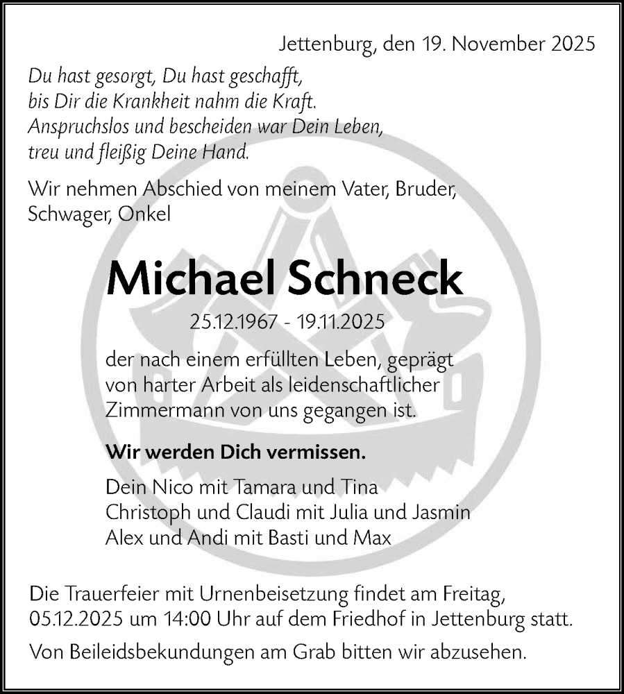 Hier finden Sie alle Traueranzeigen aus der Zeitung, die bisher für Michael Schneck erschienen sind. Weitere Traueranzeigen, die in der Zeitung erscheinen, werden hier ebenfalls aufgelistet