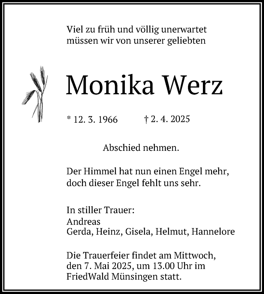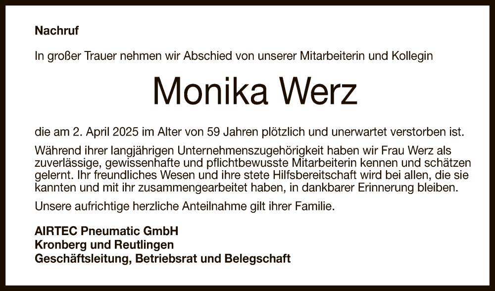 Hier finden Sie alle Traueranzeigen aus der Zeitung, die bisher für Monika Werz erschienen sind. Weitere Traueranzeigen, die in der Zeitung erscheinen, werden hier ebenfalls aufgelistet
