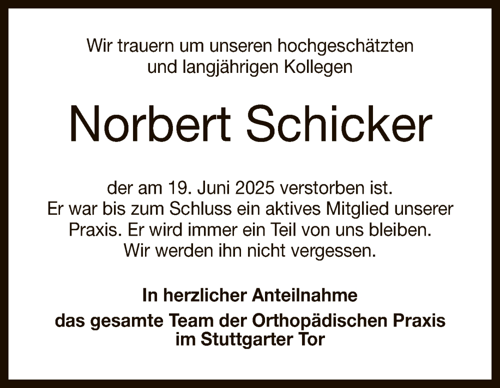 Hier finden Sie alle Traueranzeigen aus der Zeitung, die bisher für Norbert Schicker erschienen sind. Weitere Traueranzeigen, die in der Zeitung erscheinen, werden hier ebenfalls aufgelistet