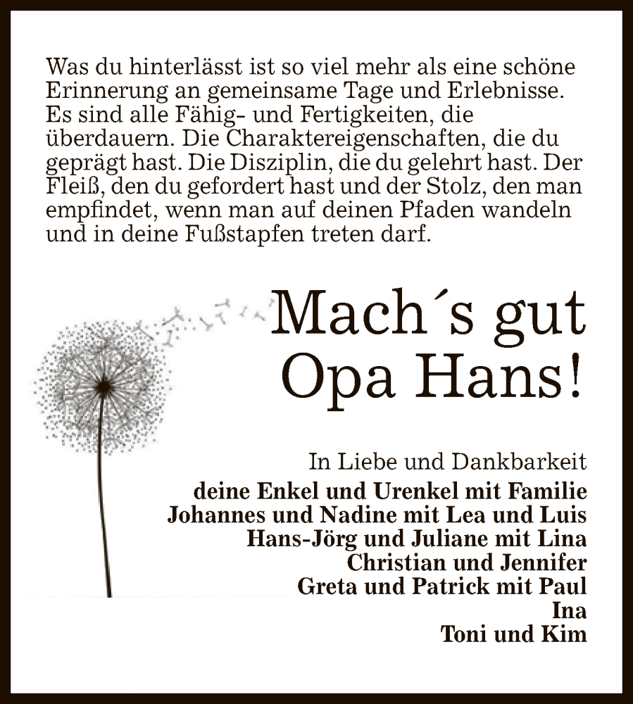 Hier finden Sie alle Traueranzeigen aus der Zeitung, die bisher für Opa Hans! erschienen sind. Weitere Traueranzeigen, die in der Zeitung erscheinen, werden hier ebenfalls aufgelistet