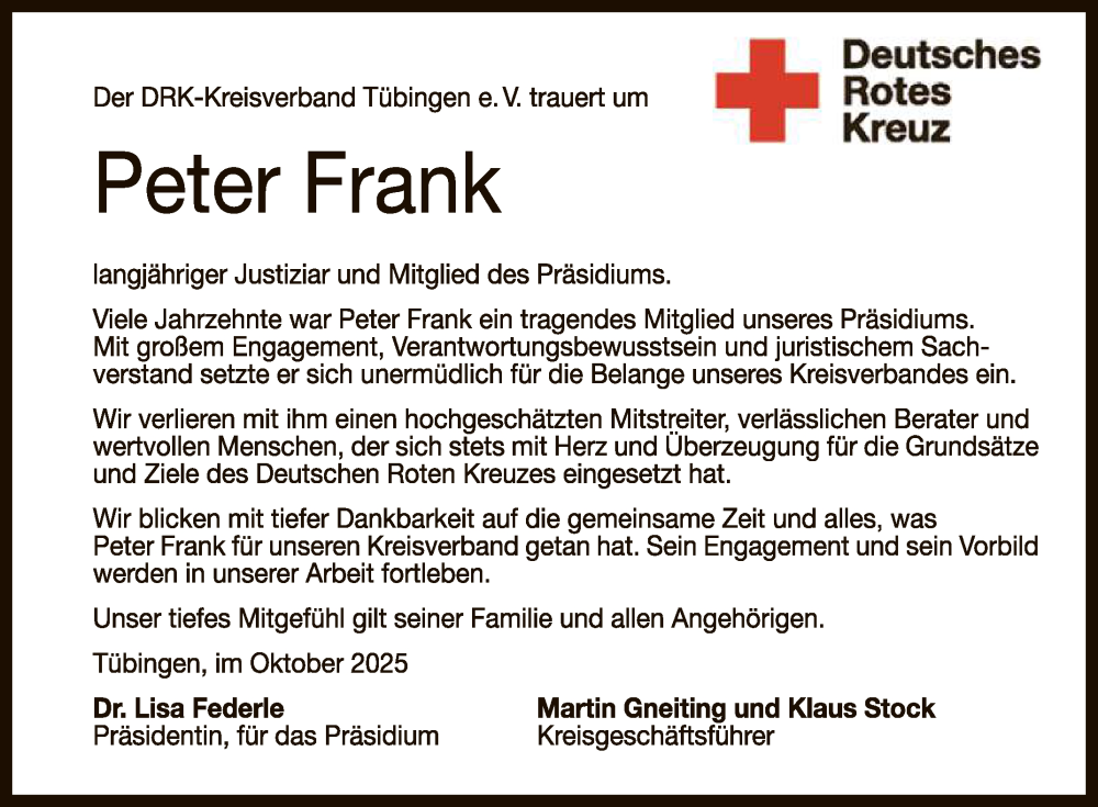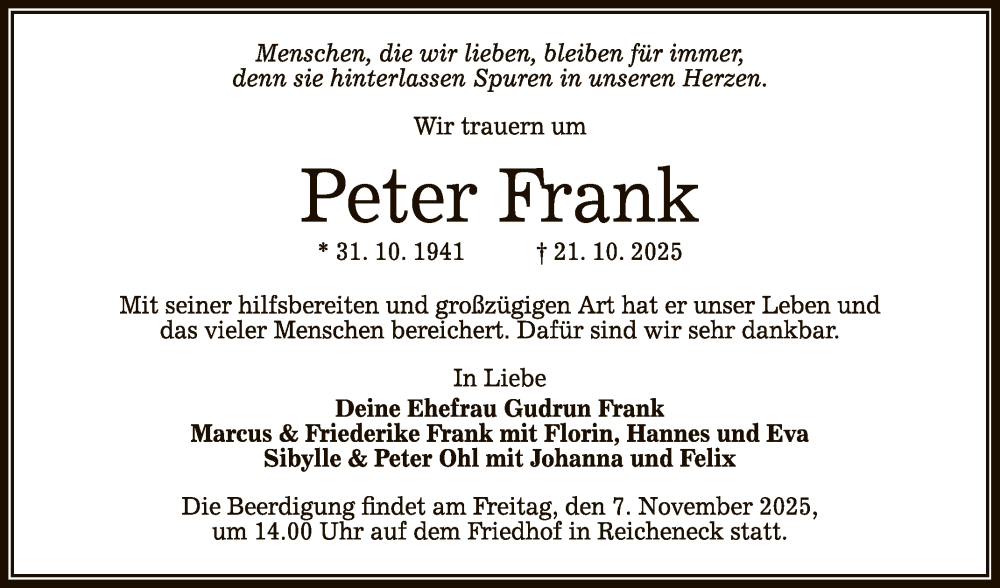 Hier finden Sie alle Traueranzeigen aus der Zeitung, die bisher für Peter Frank erschienen sind. Weitere Traueranzeigen, die in der Zeitung erscheinen, werden hier ebenfalls aufgelistet