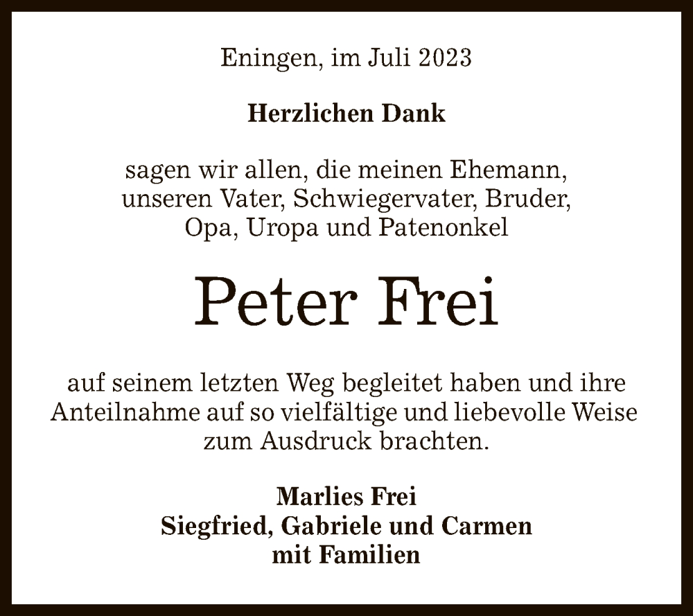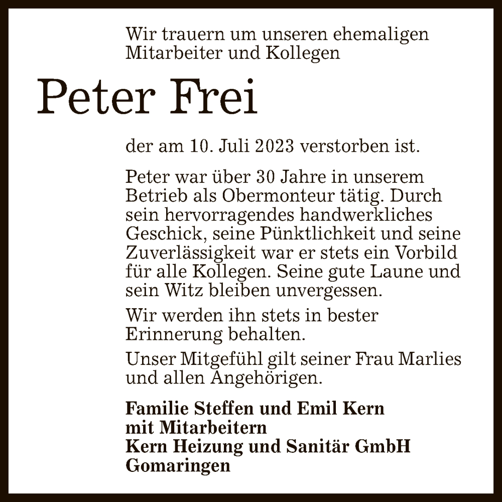 Hier finden Sie alle Traueranzeigen aus der Zeitung, die bisher für Peter Frei erschienen sind. Weitere Traueranzeigen, die in der Zeitung erscheinen, werden hier ebenfalls aufgelistet