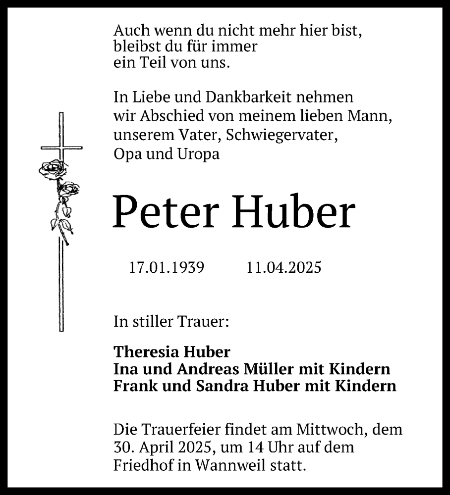 Hier finden Sie alle Traueranzeigen aus der Zeitung, die bisher für Peter Huber erschienen sind. Weitere Traueranzeigen, die in der Zeitung erscheinen, werden hier ebenfalls aufgelistet