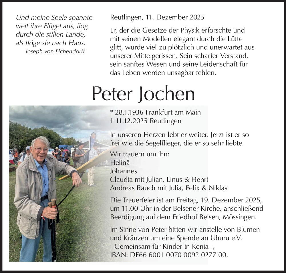 Hier finden Sie alle Traueranzeigen aus der Zeitung, die bisher für Peter Jochen erschienen sind. Weitere Traueranzeigen, die in der Zeitung erscheinen, werden hier ebenfalls aufgelistet