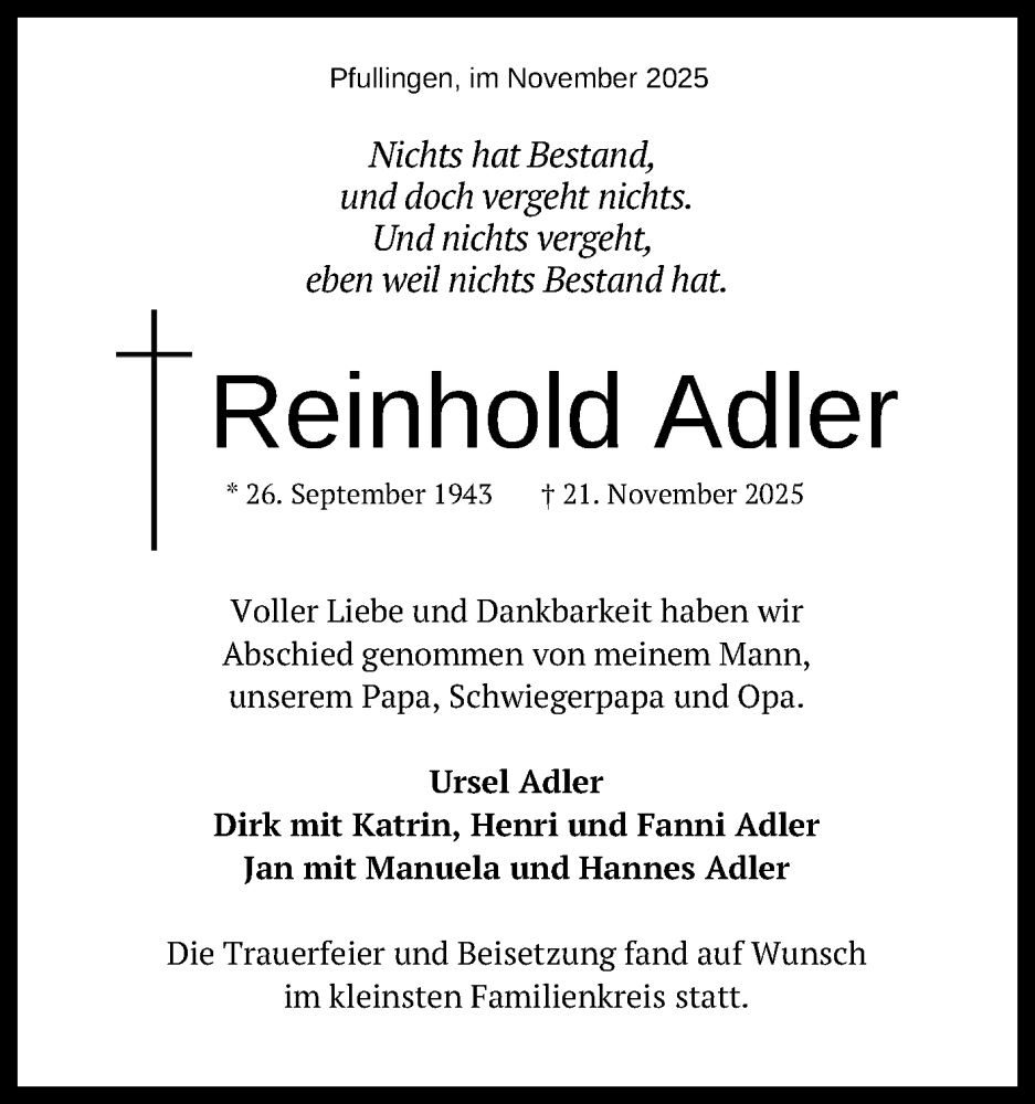 Hier finden Sie alle Traueranzeigen aus der Zeitung, die bisher für Reinhold Adler erschienen sind. Weitere Traueranzeigen, die in der Zeitung erscheinen, werden hier ebenfalls aufgelistet