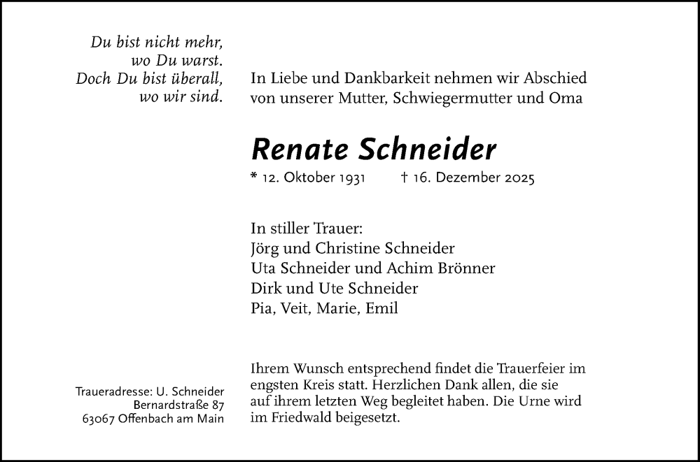 Hier finden Sie alle Traueranzeigen aus der Zeitung, die bisher für Renate Schneider erschienen sind. Weitere Traueranzeigen, die in der Zeitung erscheinen, werden hier ebenfalls aufgelistet