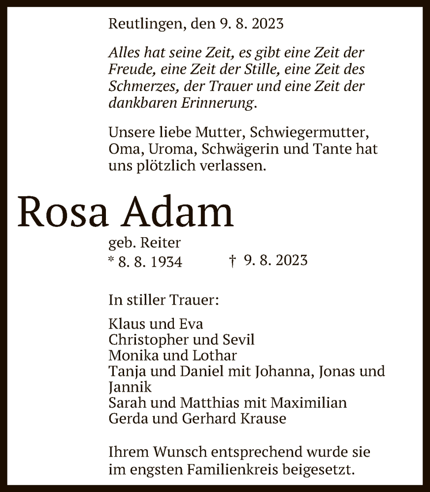 Hier finden Sie alle Traueranzeigen aus der Zeitung, die bisher für Rosa Adam erschienen sind. Weitere Traueranzeigen, die in der Zeitung erscheinen, werden hier ebenfalls aufgelistet