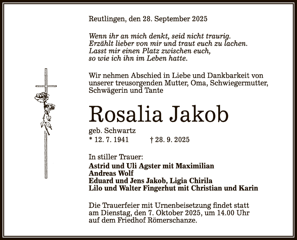 Hier finden Sie alle Traueranzeigen aus der Zeitung, die bisher für Rosalia Jakob erschienen sind. Weitere Traueranzeigen, die in der Zeitung erscheinen, werden hier ebenfalls aufgelistet