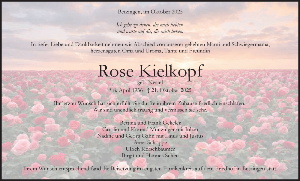 Hier finden Sie alle Traueranzeigen aus der Zeitung, die bisher für Rose Kielkopf erschienen sind. Weitere Traueranzeigen, die in der Zeitung erscheinen, werden hier ebenfalls aufgelistet