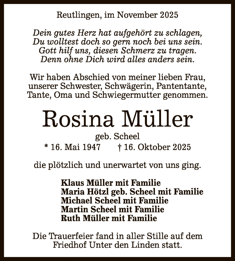 Hier finden Sie alle Traueranzeigen aus der Zeitung, die bisher für Rosina Müller erschienen sind. Weitere Traueranzeigen, die in der Zeitung erscheinen, werden hier ebenfalls aufgelistet
