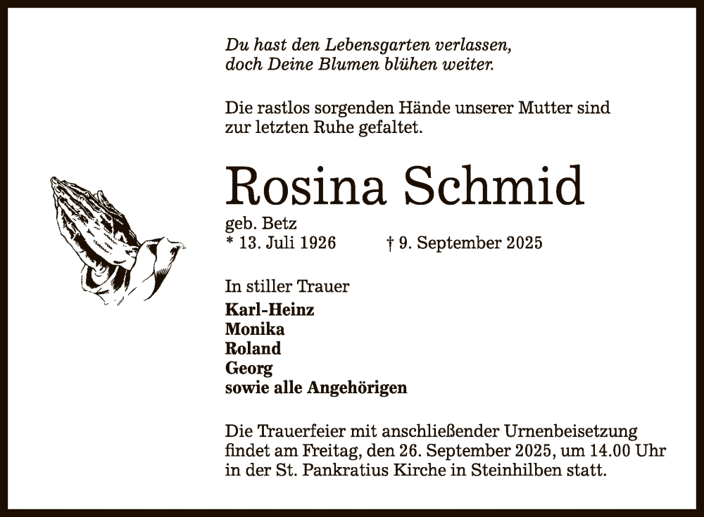Hier finden Sie alle Traueranzeigen aus der Zeitung, die bisher für Rosina Schmid erschienen sind. Weitere Traueranzeigen, die in der Zeitung erscheinen, werden hier ebenfalls aufgelistet