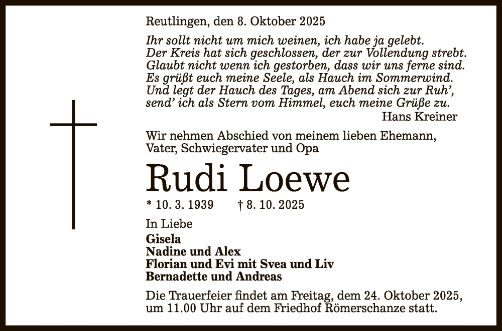Hier finden Sie alle Traueranzeigen aus der Zeitung, die bisher für Rudi Loewe erschienen sind. Weitere Traueranzeigen, die in der Zeitung erscheinen, werden hier ebenfalls aufgelistet