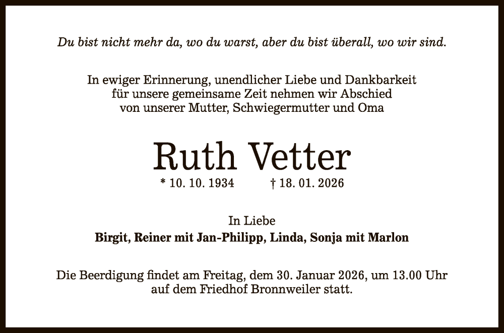 Hier finden Sie alle Traueranzeigen aus der Zeitung, die bisher für Ruth Vetter erschienen sind. Weitere Traueranzeigen, die in der Zeitung erscheinen, werden hier ebenfalls aufgelistet