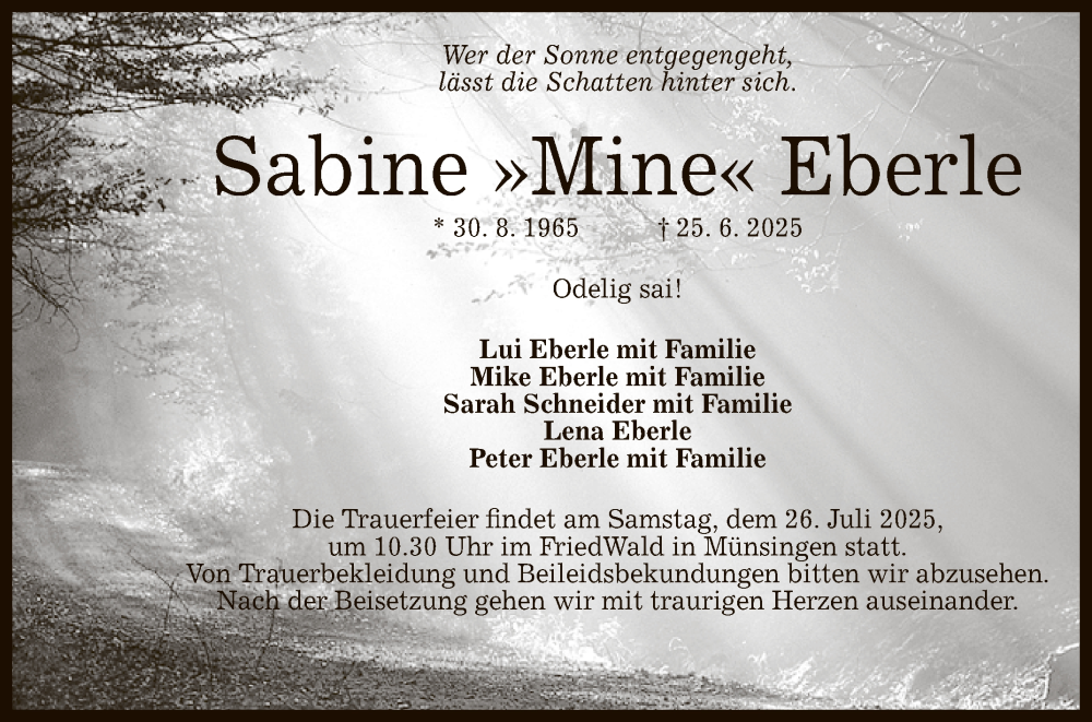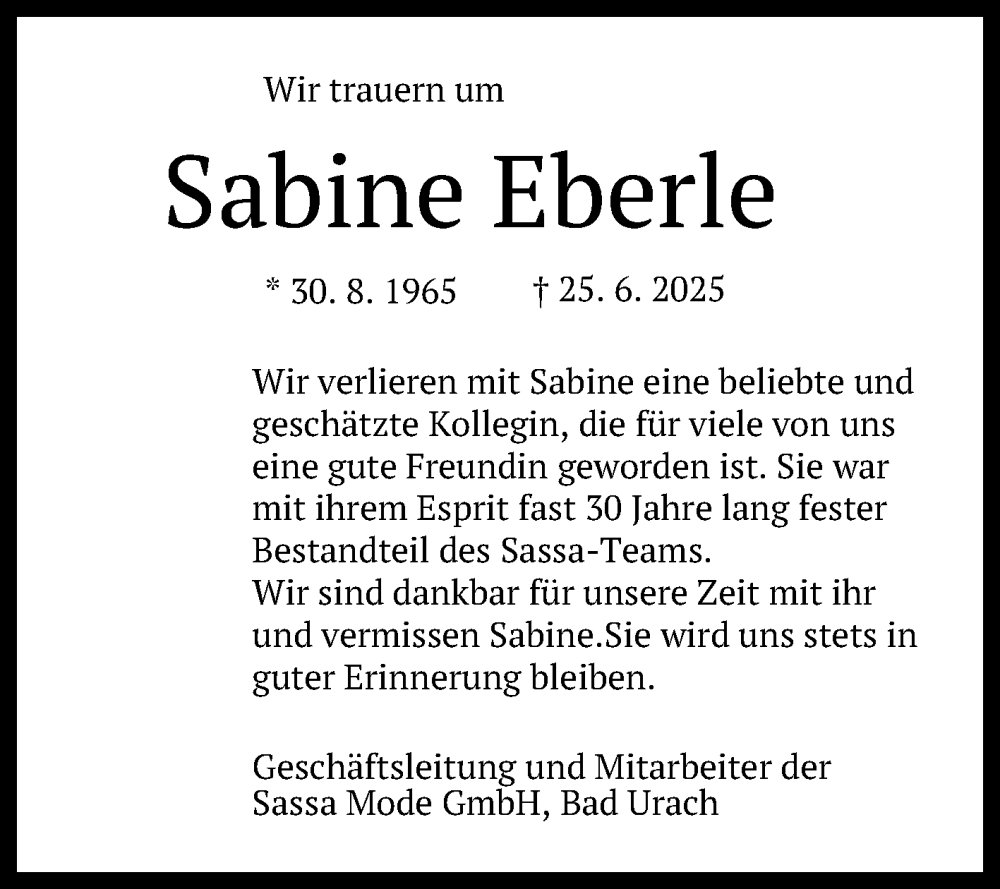 Hier finden Sie alle Traueranzeigen aus der Zeitung, die bisher für Sabine Eberle erschienen sind. Weitere Traueranzeigen, die in der Zeitung erscheinen, werden hier ebenfalls aufgelistet