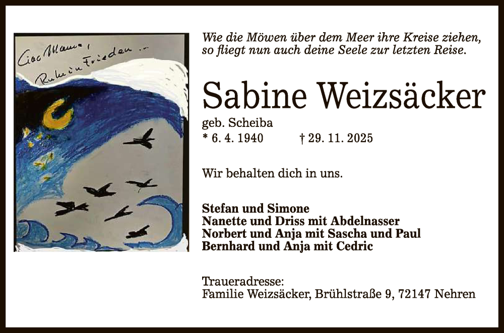 Hier finden Sie alle Traueranzeigen aus der Zeitung, die bisher für Sabine Weizsäcker erschienen sind. Weitere Traueranzeigen, die in der Zeitung erscheinen, werden hier ebenfalls aufgelistet