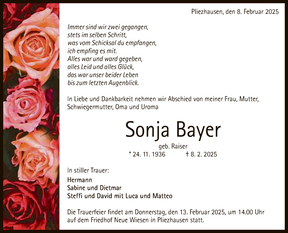 Hier finden Sie alle Traueranzeigen aus der Zeitung, die bisher für Sonja Bayer erschienen sind. Weitere Traueranzeigen, die in der Zeitung erscheinen, werden hier ebenfalls aufgelistet