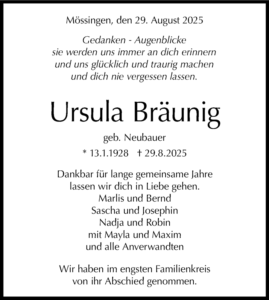 Hier finden Sie alle Traueranzeigen aus der Zeitung, die bisher für Ursula Bräunig erschienen sind. Weitere Traueranzeigen, die in der Zeitung erscheinen, werden hier ebenfalls aufgelistet
