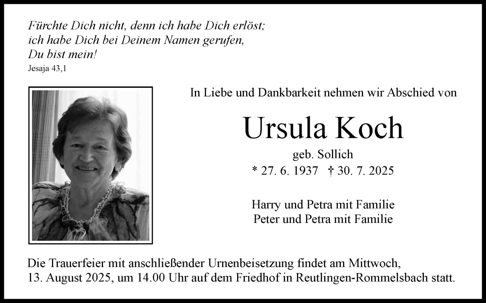 Hier finden Sie alle Traueranzeigen aus der Zeitung, die bisher für Ursula Koch erschienen sind. Weitere Traueranzeigen, die in der Zeitung erscheinen, werden hier ebenfalls aufgelistet