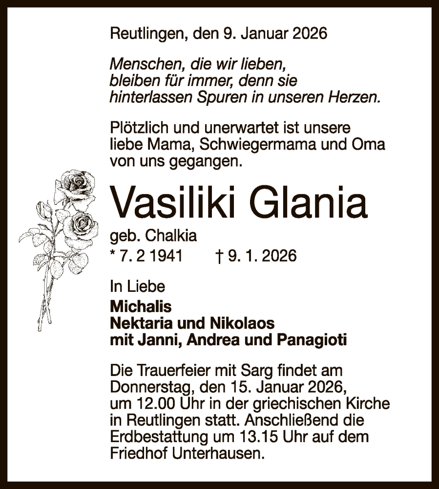 Hier finden Sie alle Traueranzeigen aus der Zeitung, die bisher für Vasiliki Glania erschienen sind. Weitere Traueranzeigen, die in der Zeitung erscheinen, werden hier ebenfalls aufgelistet