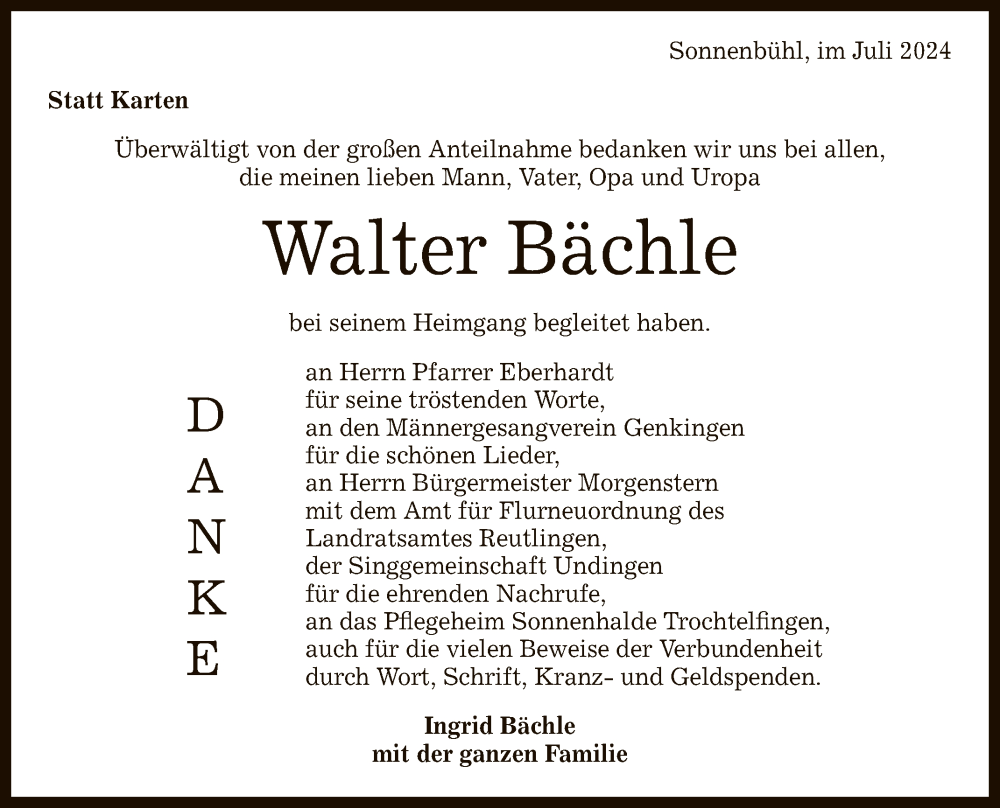 Hier finden Sie alle Traueranzeigen aus der Zeitung, die bisher für Walter Bächle erschienen sind. Weitere Traueranzeigen, die in der Zeitung erscheinen, werden hier ebenfalls aufgelistet
