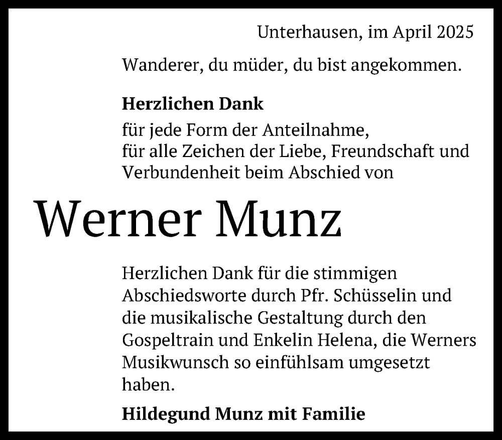 Hier finden Sie alle Traueranzeigen aus der Zeitung, die bisher für Werner Munz erschienen sind. Weitere Traueranzeigen, die in der Zeitung erscheinen, werden hier ebenfalls aufgelistet