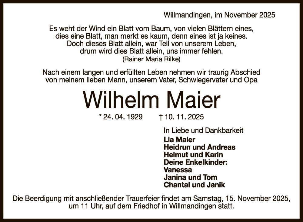 Hier finden Sie alle Traueranzeigen aus der Zeitung, die bisher für Wilhelm Maier erschienen sind. Weitere Traueranzeigen, die in der Zeitung erscheinen, werden hier ebenfalls aufgelistet
