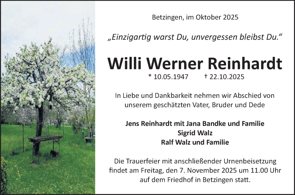Hier finden Sie alle Traueranzeigen aus der Zeitung, die bisher für Willi Werner Reinhardt erschienen sind. Weitere Traueranzeigen, die in der Zeitung erscheinen, werden hier ebenfalls aufgelistet