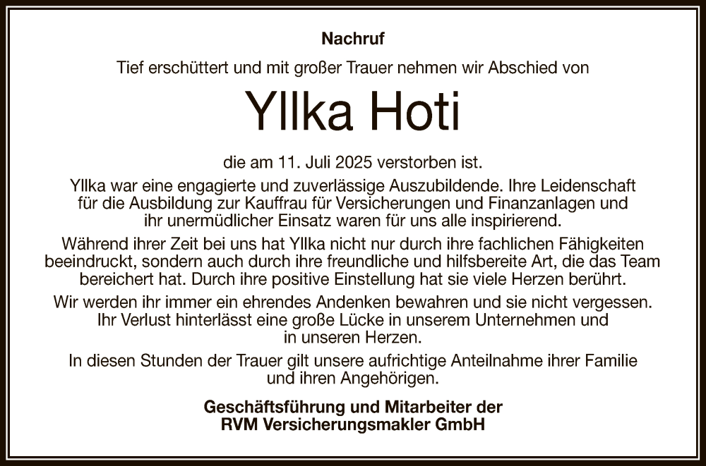 Hier finden Sie alle Traueranzeigen aus der Zeitung, die bisher für Yllka Hoti erschienen sind. Weitere Traueranzeigen, die in der Zeitung erscheinen, werden hier ebenfalls aufgelistet